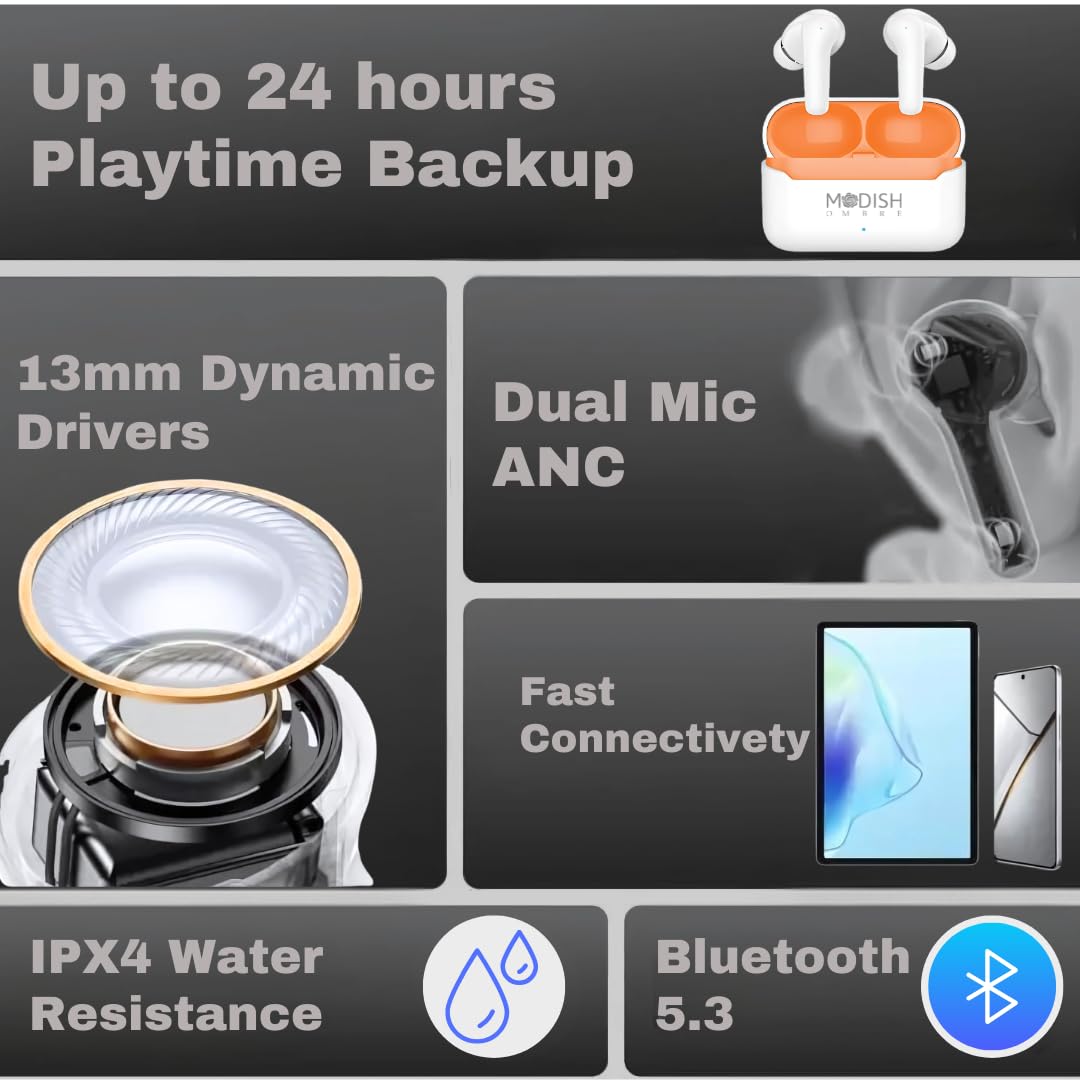 Dual Mic Active ENC (Environmental Noise Cancellation): Equipped with dual high-quality microphones that work together to filter out background noise, ensuring crystal-clear calls even in noisy environments. Ideal for professionals who need reliable audio for calls and meetings. 24 Hours Battery Life: Provides an impressive total of 24 hours of playtime with the charging case, ensuring you can enjoy your music, podcasts, or gaming sessions without frequent recharging. The earbuds themselves offer several hours of continuous use on a single charge, with the charging case providing multiple recharges. 40 MS Latency: Features ultra-low latency of 40 milliseconds, making them perfect for gamers who require quick audio feedback and synchronization. Enhances the gaming experience by reducing lag, ensuring that audio cues are received in real-time. Bluetooth 5.3: Utilizes the latest Bluetooth 5.3 technology for a more stable and faster connection. Ensures efficient power consumption, better range, and improved overall performance compared to previous Bluetooth versions. Sweat Resistance: Designed with a sweat-resistant coating to protect the earbuds from moisture and perspiration. Suitable for intense workouts and outdoor activities, providing durability and reliability in various conditions. ExtraBass Technology: Engineered with ExtraBass technology to deliver deep, punchy bass for an immersive audio experience. Perfect for bass enthusiasts and those who enjoy rich, full-bodied sound.