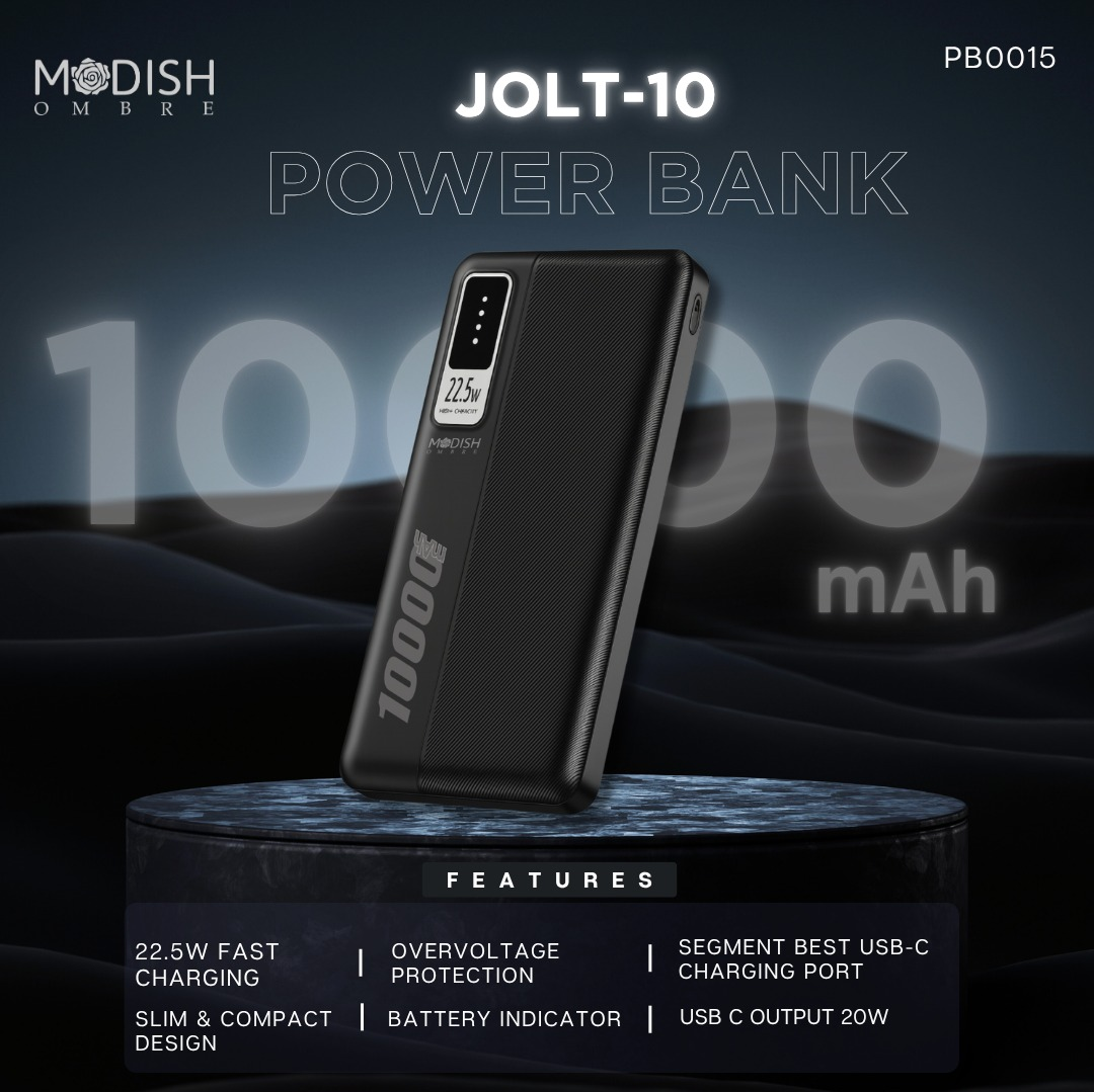 22.5W Fast Charging ⚡ The Modish Ombre JOLT 10 Power Bank supports 22.5W fast charging, allowing you to charge your smartphones, tablets, and other devices quickly and efficiently. Fast Power Delivery (PD) ensures that devices are powered up in less time compared to standard chargers, making it perfect for when you’re in a hurry. Multiple Output Ports ???? Dual USB-A Ports: One port is designed for fast charging, while the other delivers standard charging speeds. This versatility lets you charge two devices simultaneously at optimal speeds. Type-C Output Port: Offers fast charging for Type-C compatible devices (such as newer Android phones, tablets, and even laptops), ensuring quick power delivery. Universal Compatibility ???? Compatible with a wide range of devices, including smartphones, tablets, power banks, and more. Supports charging for both Android and iOS devices, including iPhones, iPads, Samsung Galaxy, OnePlus, Xiaomi, and other USB/Type-C devices. High-Capacity 10,000mAh Battery ???? 10,000mAh capacity provides enough power to recharge most smartphones 2-3 times before the power bank itself needs recharging. The Lithium Polymer battery ensures long-lasting performance and is designed to maintain high capacity even after multiple charging cycles. Intelligent Charging Protection ????️ Built-in smart protection system offers safety features such as: o Overvoltage Protection: Prevents voltage from exceeding the safe limit for your devices. o Overcurrent Protection: Safeguards your devices from excessive current flow, preventing potential damage. o Overheating Protection: Automatically controls temperature to prevent overheating during charging. o Short Circuit Protection: Instantly cuts off power to avoid any short circuits or electrical hazards. Compact, Lightweight & Portable Design ✈️ The Modish Ombre JOLT 10 Power Bank is compact and lightweight, making it easy to carry around. Perfect for travel, work, and daily use, as it fits comfortably in your bag or even your pocket, offering on-the-go charging wherever you are. Premium Build & Durability ???? Constructed from high-quality ABS plastic, ensuring the power bank is sturdy, durable, and resistant to wear and tear. The sleek, ergonomic design is comfortable to hold and provides a premium feel, offering both aesthetics and durability. Easy-to-Use LED Indicators ???? Equipped with LED indicators to display the remaining battery level of the power bank. Conveniently shows how much charge is left, so you know when it's time to recharge the power bank.