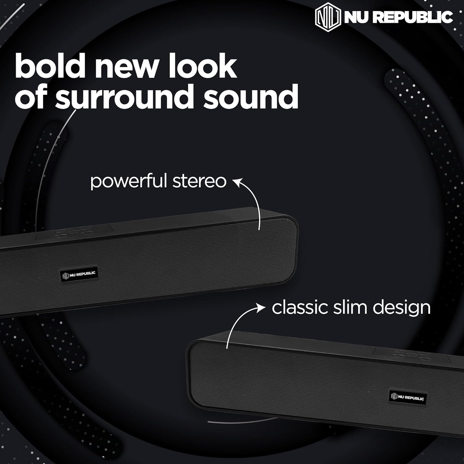 Nu Republic Soundbar 20 Bluetooth Soundbar with X-Bass Technology, 52mm Dynamic Drivers, Upto 12 Hrs Playtime, 20 W Output, Aux/USB Port (5.0 Channel) About this product • Immersive Sound: The Nu Republic Soundbar 20 Powered by X-Bass technology with 52mm Dynamic drivers, delivers a potent 20-watt output, providing a cinematic audio experience at home. Perfect for gaming marathons, movie nights, and everyday music listening. • Long-lasting Battery: The Nu Republic Soundbar 20 offering up to 12 hours of playtime. Enjoy your favourite music, movies, or games for longer without worrying about recharging. • Multiple Connectivity: The Nu Republic Soundbar 20 offers a variety of connectivity options for your convenience. Connect your devices via Aux, USB, TF Card, or stream music wirelessly with Bluetooth. It's all about offering you the flexibility to enjoy your music your way. • Bluetooth V5.3: Enjoy a seamless, high-quality audio experience with the latest Bluetooth V5.3 technology. Connect your mobile device automatically and play your favourite tunes louder and clearer than ever.
